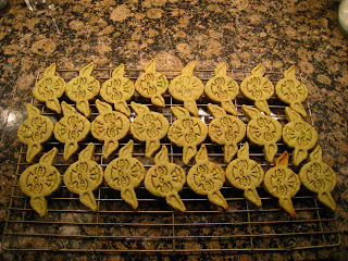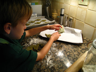 Line a baking sheet (or 3) with greaseproof baking paper and ensure that your cookies are well spaced with at least an inch around each one.  Here in Texas, the heat and humidity are ridiculous even at this time of year and so I've found that re-chilling the cut cookies at this point really helps them to maintain definition.  Just half an hour in the fridge really helps.