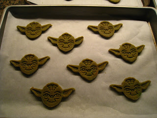 Preheat the oven to 350 F (180 C), and then bake for 8-10 minutes depending on your oven.  Once done, cool on a wire rack before allowing your young Padawan's to enjoy them with a glass of blue milk!  Another idea... sandwich two cookies together with buttercream icing or vanilla icecream for an extra treat!  As Yoda would say, "Yummy, they are.  Hmmmm?!"