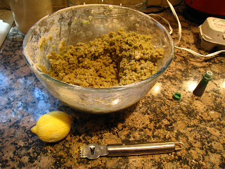 First sift dry ingredients into a large, roomy bowl.  In another bowl put the softened butter and sugar and beat with an electric mixer (or by hand if you can be bothered) until creamy.  Add the egg and beat in.  At this point you can add your food colouring and mix until you get a nice Yoda-ish green!  I also add the lemon zest at this point, but this is up to you!