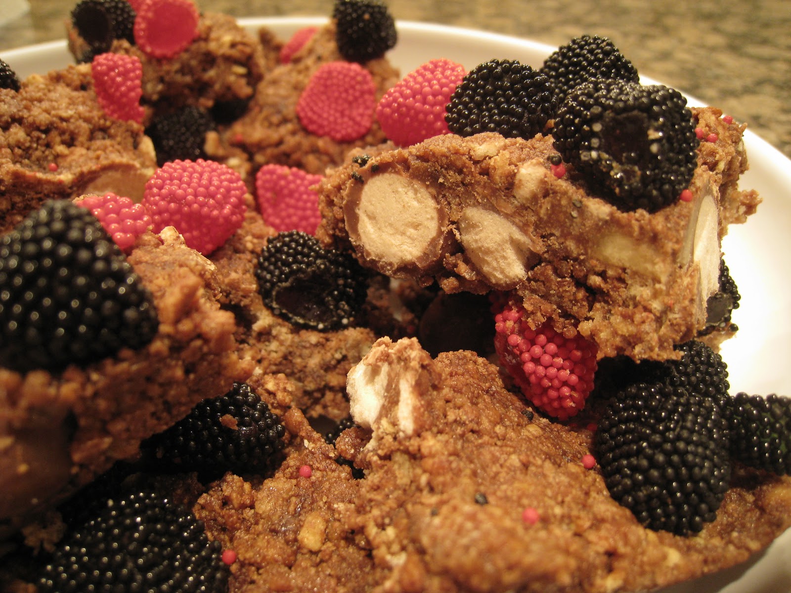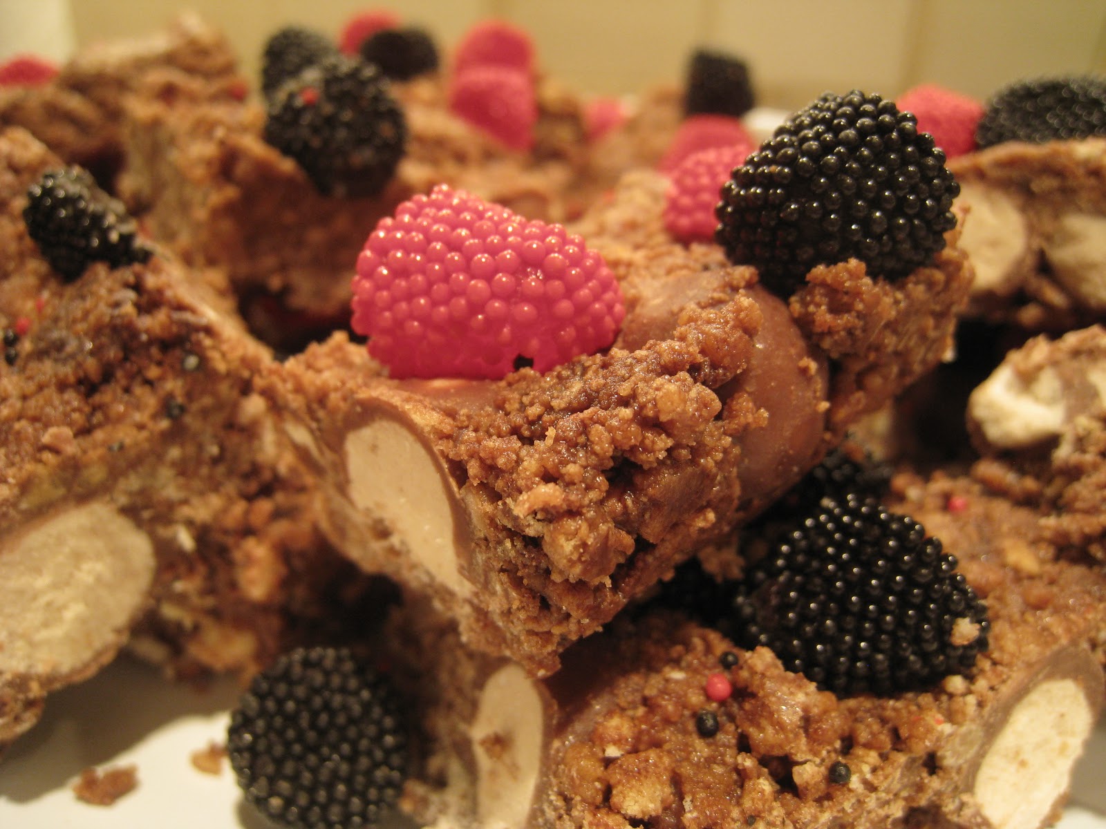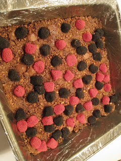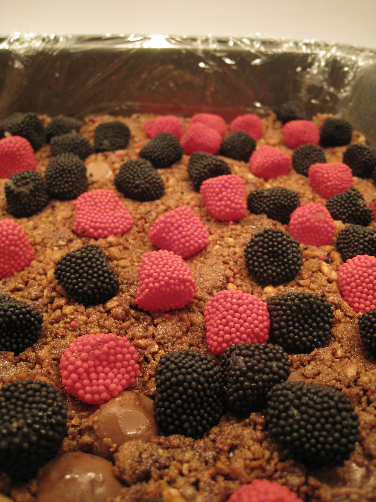 Finally, tip the mixture into the lined pan and press down well, but without crushing the whole Maltesers (Whoppers)! Decorate the top of the cake with red and black candies or sprinkles to resemble the evil Darth Maul's face! I used Gimbal's Rasberries and Blackberries (jelly sweets with little candy beads that make them look like the real berries), but any red and black candy could be used! Again, press gently into the top to fix.