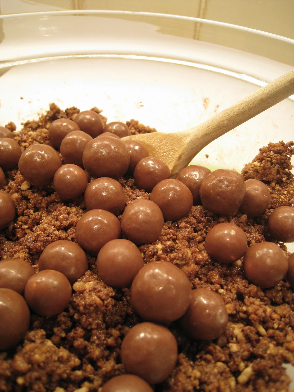 Crush up the digestive biscuits (Graham crackers) and half the Maltesers (Whoppers). You can do this in a food processor or by putting them in a sealed plastic food bag and giving them a good ol' bash with a rolling pin! Put the crushed biscuits and maltesers into a large bowl and add the cocoa powder. Then pour in the melted butter and syrup and stir until well combined.