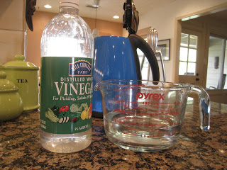 - Mix white distilled vinegar with plain tap water (a ratio of approximately 1:1 is fine, but I tend to add a little more vinegar for an extra punch)!