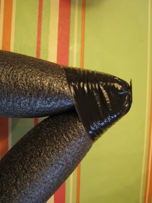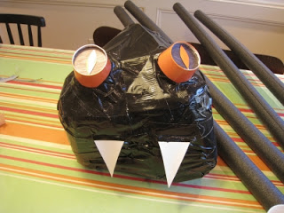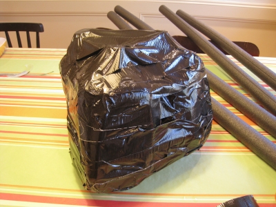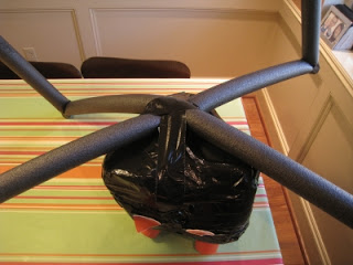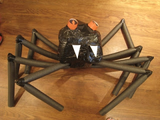 To make the legs look spider-ish, you will first need to make joints in them. I bent the legs and used the duct tape to create the joint. I did this 1/4 and 3/4 of the way down each of the foam tubes... basically each tube is two legs. You end up with 4 tubes bent to look like tables (ish). Then turn the body of the spider over and use the duct tape to attach the legs.