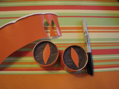 Then you need to create the face. I used a few orange paper cups to create eyes and fangs. Cut two of the cups down to only 1 inch high, then use a Sharpie marker to color the base black. Cut some diamond shaped pupils out of the leftover cup and glue them on the bases to make scary eyes. Then attach them to the spider with more duct tape. Cut large triangles from the third cup to be fangs and tape them white side out below the eyes.