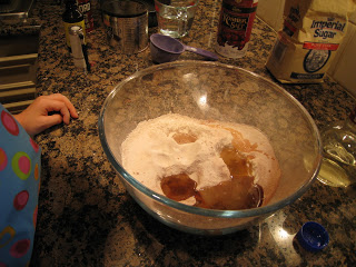 Pour in the water and then mix it all together. It will start to froth slightly as the vinegar and baking powder interact. This is what creates the light, authentic (without wanting to offend Vegans) cake-like structure that is so often missing in other egg-less cakes! And believe me I've tried. We are very close friends with a Vegan family and so I've tried all manner of techniques trying to cut the eggs in cakes (ground flaxseed mixed with hot water was one and commercial egg replacement another) and the results have invariably been dry or flat.