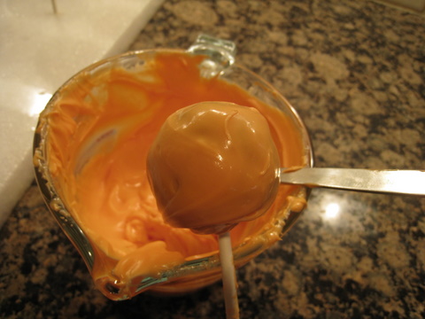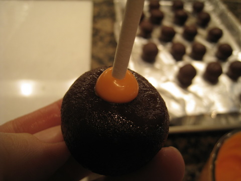 Your cake pop balls should be nice and firm straight from the fridge, but may have flat bottoms where they've sat on the cookie tray. I like to stick the stick in the flat side. Dip the lollipop stick in the melted chocolate so that the last 1/2 inch is coated, then push it gently into the cake ball so that it goes to the middle. This is where the styrofoam sheet comes in handy, as you can then push the lollipop stick into the foam to wait for the chocolate to harden. Fix all the sticks in the pops.