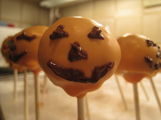 If you want to decorate the cake pop with a face (like the Jack O' Lanterns) you can melt a small amount of candy in a piping bag (in the microwave is easiest), and then you can decorate with your chosen design. This does take a steady hand and I found it quite frustrating! So next time, I'm planning to try some candy writers (pens specifically designed for writing on candy/chocolate).
