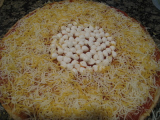 Next, sprinkle the cheddar cheese around the rest of the pizza base, all the way to the edges.