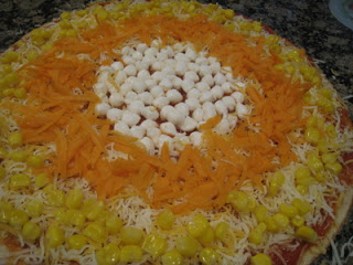 You will then need to create a ring of orange pizza toppings around the mozzarella in the center. And then around the edge, a ring of yellow pizza toppings. I used grated carrot and then a mix of sweetcorn and yellow bell peppers.