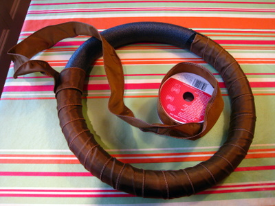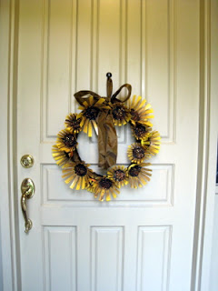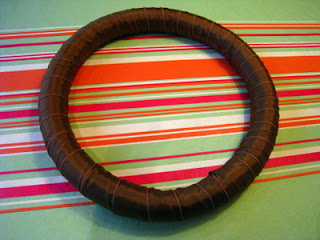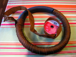 While waiting for the flowers to dry you can create the wreath ring. You can buy ready made wreath rings in most craft shops... they are available in styrofoam, raffia and wire. However, they can be quite pricey depending on the size (they were $10 in my local store!). A much thriftier idea is to create one from either a length of pipe insulation (which you can get for about $1 at a DIY store) or grab one of those swimming noodles for kids that you get in the Dollar Store! Cut it to the desired length and bring the ends together to make a ring (opposing angled cuts make this much easier). Tape the ends together with duct tape and you're set to go! Once you have created your wreath ring it is a good idea to wrap it in some seasonal colored wide ribbon... that way the gaps between your flowers look good too! Make sure you have enough ribbon remaining to create a bow and loop to hang your wreath! I had a roll with 25 feet of 2" wide ribbon and this was the perfect amount!