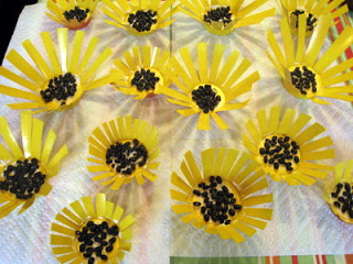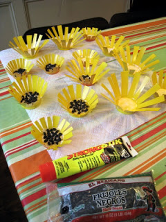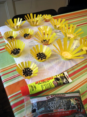 Once the yellow paint is dry, you can then start work on making the cups look more like sunflowers. In the center of each flower (the inside base of the cup) spread a large blob of glue (PVA or craft glue is fine). While the glue is still wet sprinkle over it a small handful of dried beans. Leave to dry.