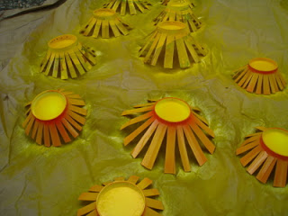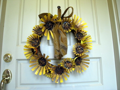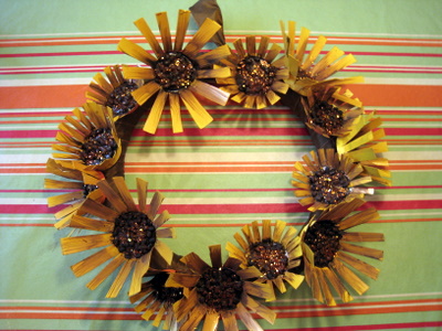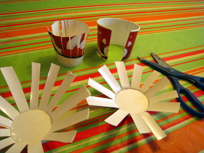 To create a wreath to celebrate the golden warmth of Autumn harvest, I could think of nothing better than beautiful sunflowers! They are a native species here in America, and produce flowers well into Fall, especially here in the South. The image of sunflowers hanging up to dry so their seeds can be harvested is a potent symbol of harvest time and Thanksgiving! So the first task in making this wreath is to create some sunflowers! For this you will need a variety of paper coffee cups and some scissors. Cut the cups down in height so that they are only about 2-3 inches tall. Then create vertical cuts in the sides of the cup all the way down to the base. The cuts should be spaced about 1/4-1/2 an inch apart. Then fan out the sides of the cup to create a flower shape.