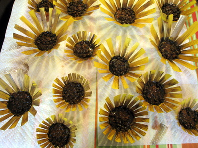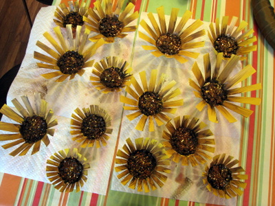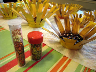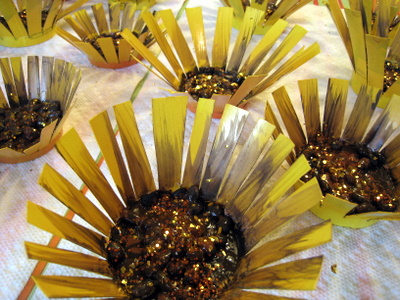 Then you will need to mix up some brown and black acrylic paint. Don't fully mix the two colors together so that you have a mottled finish. Paint thickly over the beans so the base of the cup is completely covered. Then mixed a little of this paint with some water (approximately 1:1 ratio) so that you have a thin, watery paint. Using rough brush strokes paint over the yellow petals. The idea is to create a rustic, textured look so don't try to be too neat ... the brushstrokes and drips add to the look! While the paint is still wet, a little bronze/gold glitter over the center really adds some seasonal sparkle! Leave the flowers to dry.