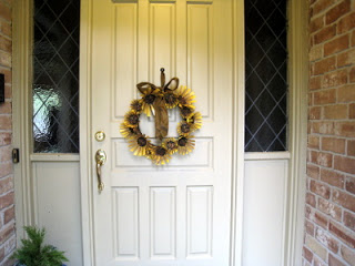 Finally, you will need to fix your flowers onto your wreath. You could use a hot glue gun for this (on my Christmas list!) or just use dressmaking pins like I did! The advantage of using pins is that they flowers are re-positional... useful when trying to space them out in an eye-pleasing arrangement! Finish with a loop of ribbon at the top to hang it from your door and a large bow! Ta-dah!!!! Hang from your front door and feel smug (and saintly for your thrifty & eco-conscious efforts) when you see the envious looks from your neighbors & visitors!