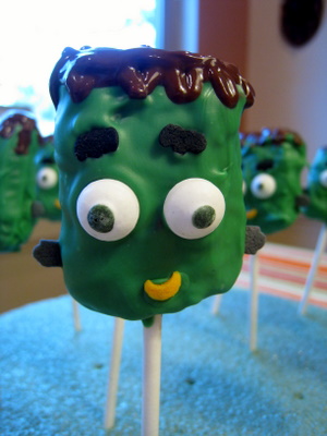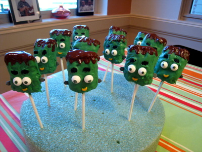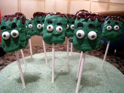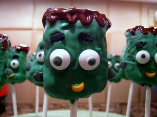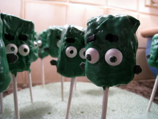 This is a very easy project. Simply fix a lollipop stick into the snack bar, cookie or brownie and then decorate as for a cake pop. My earlier post with the Jack O Lantern cake pops I made for a school bake sale has detailed instructions on how to do this! I cut my energy bars in half to make them the perfect size. I thought that the rectangular shape was just crying out to be turned into Frankenstein's Monster, but it would also make a fabulous Sponge Bob Squarepants! Because the texture of the energy bar is quite pliable I guess I could have rolled it into a ball if needed. I used green candy melts to cover the whole snack. Then created the monster's face with a selection of seasonal candy sprinkles... candy eyes, bats for the eyebrows, tombstones for neck bolts and a moon for the mouth. I then dipped the very top in dark chocolate and used a spare lollipop stick to create the look of hair.
