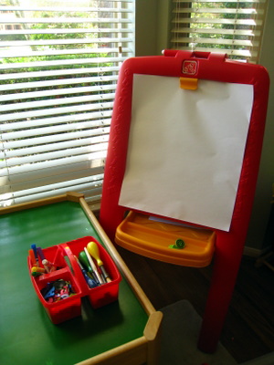 - Craft area - depending on the age of your children, you may or may not want your craft supplies readily available to little hands! We have an art easel set up in the playroom and this does have a storage tray in which I could store pens and crayons etc... I actually choose not to store them here, preferring to keep them out of reach after a few graffiti incidents!