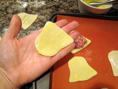 Grease a baking sheet, or use a silicone liner or baking parchment. Place half of the cut-outs (the non-imprinted half) onto the sheet making sure they are well spaced. Then using a pastry brush, carefully cover them in beaten egg, making sure to go all the way to the edges. You will then need to get a small dollop of your filling and shape it to fit the cut-out with a 1/4 inch (6mm) gap all the way around. Put it on top of the pastry cut-out on the sheet. Then egg-wash the underside of one of the imprinted cut-outs and place on top of the sausagemeat. Gently pinch the edges of the two pastry shapes together, taking care not to change the shape too much or to squash the imprint. Once all prepared, use the remaining beaten egg to brush over the top layer. This will help them to go golden brown and to highlight the imprinted features.