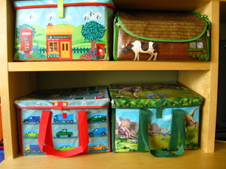 A trick I learned from our wonderful childminder back in Berkshire is to rotate the toy boxes. Don't allow the children access to all the toys at once. This has a number of benefits. Firstly, they get excited and enthusiastic to play with toys that they haven't seen for a few weeks. Secondly, it limits the sheer quantity of toys you can have strewn across the floor at any one time. We try to enforce the rule that they must tidy up the contents of one box of toys first, before moving onto the next, although in practice it doesn't always work. So to put some of the toys in temporary storage, while you rotate to a different set will achieve this in a self-limiting way!