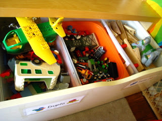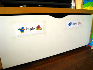 It is hard to expect your children to help with tidying up if they don't have a clue where things are supposed to go! The specific storage solutions suggested above will definitely help... it is obvious even to a very small child that the dinosaurs belong in the dinosaur zipbin, for example! Not being able to read, preschool aged kids rely heavily on visual cues, so help them out... labels with pictures as well as the words will help your child identify where toys belong, but will also help foster early literacy skills. You can either draw simple images or borrow images from the internet and paste into a document you can print out.