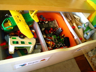 Make tidying up easy by having obvious homes for everything and suitable storage containers. One of the best tips I can suggest is to group similar toys in themed storage boxes or bins. This enables the children to easily find the toy they want without having to turn out the whole lot of them. It's also easier to instill good habits/routines. We have a rule that the kids must pack away the box they're playing with before they get out another! Getting appropriate storage is key: