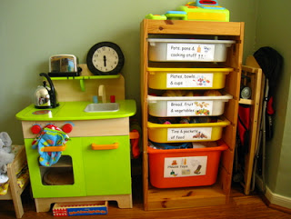 - Home corner - the boys play kitchen, dolls & doll bed, and all the play food is grouped together in one corner. The kids can then play at being grown-ups in their own 'home'. Our play table is next to this area and this doubles up as a dining table for playing 'families'! Cute, eh?!