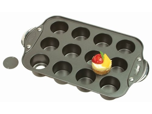 The Norpro 3919 Mini Cheesecake Pan has 12 individual cups with removable bases to enable easy release and while it is described as a cheesecake pan I see no reason why you could not use it for a variety of bitesize appetisers or desserts, for example muffins or quiches. Each cup measures 2 inches diameter and is 1-3/4 inches deep, and holds approximately 3 fl oz (90ml). The pan itself has non-stick coating, plus riveted stainless steel handles. It is dishwasher safe.