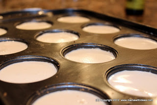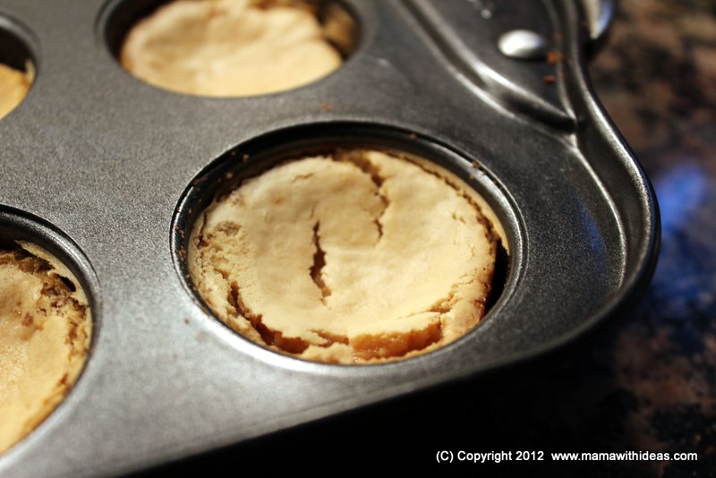 Bake in the oven for approximately 20 minutes or until golden brown on top. It may look jiggly still but will carry on cooking in the next step. Turn the oven off, and open the door an inch or two and leave the cheesecakes in there for an hour. At the end of the hour, take the pan out of the oven. Insert a skewer in the cheesecake to ensure it is done... it should come out clean.