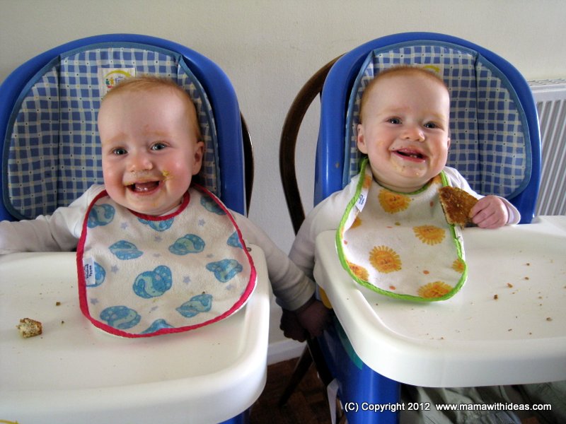 1. Mash a ripe banana & avocado together with a fork for a quick and easy no-cook baby meal, suitable as a first food from 6 months. The Shouty One (left) and Chubby Cheeks one seemed to enjoy it greatly ... it's banana and avocado on their faces in the photo below... not snot, honest!!