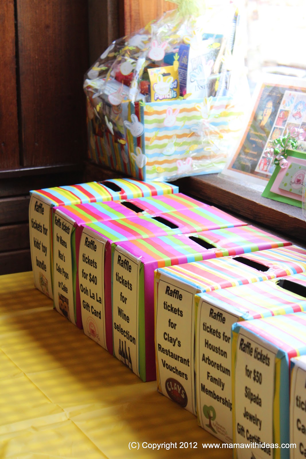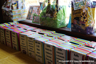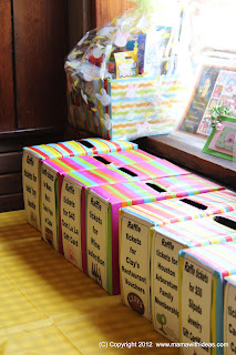 This could not be easier... simply wrap the box in gift wrap paper leaving one end open. Find the handle slot and make a slit in the wrapping paper, fold the paper into the slot (and into the box) and secure inside with sticky tape. Close the open end of the box loosely (no need to tape shut) and complete the wrapping. This will be the end of the box you open to stick your hand in to draw the raffle tickets! On the other end of the box you can add a label so that people know what draw they are entering! Then people simply post their raffle tickets into the boxes they want to enter the draw for (remembering to keep the other half of their tickets!).