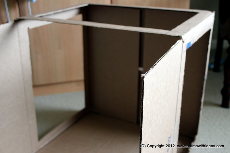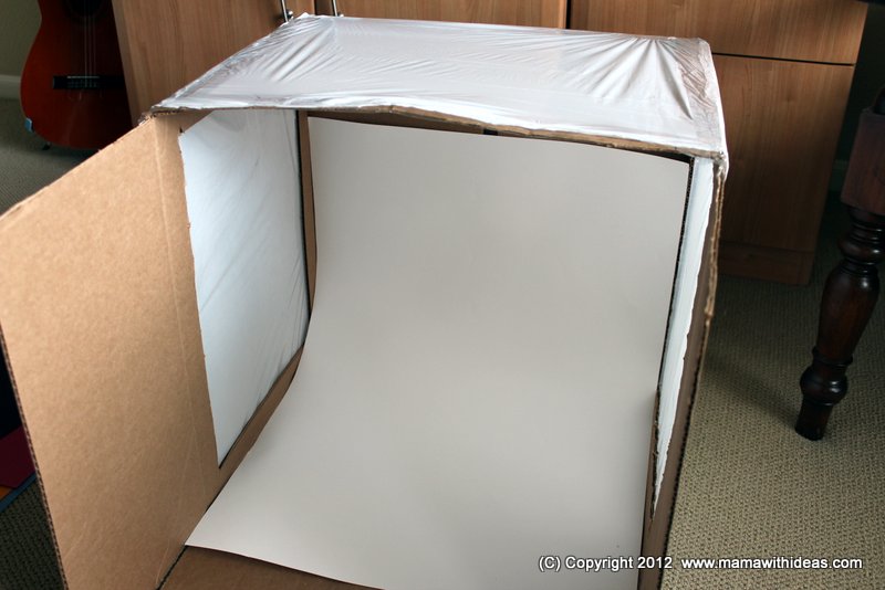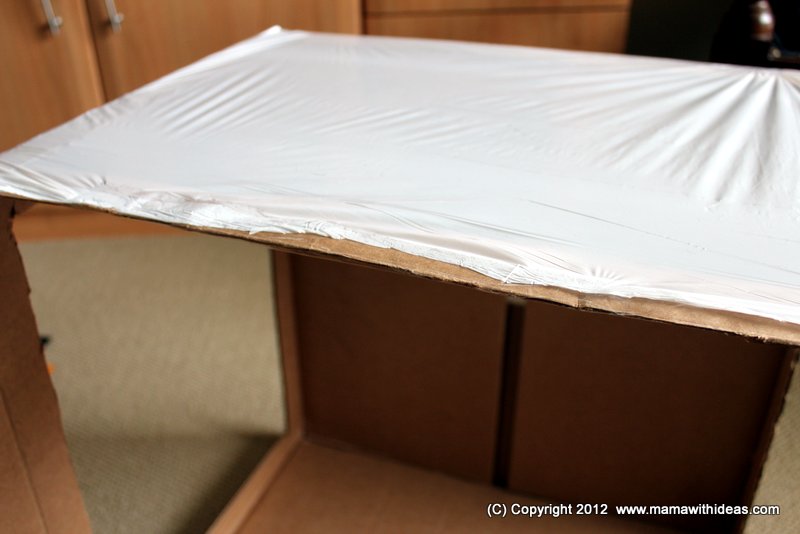 Cut a section of your white trash bags (or muslin fabric) to fit the hole you cut in the box and tape in place. Repeat for the other 2 sides.