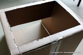 Repeat on 2 other sides of the box. Tip the box onto the intact side with the top open (you may have to trim the flaps of the open top. Keep the base of the box taped shut.