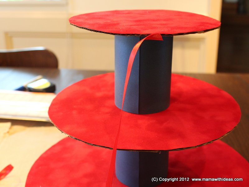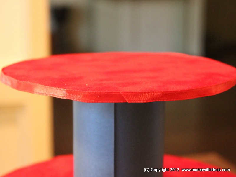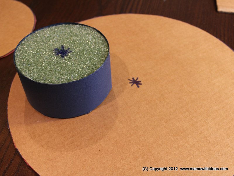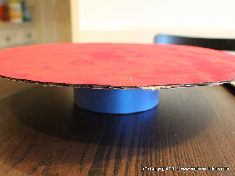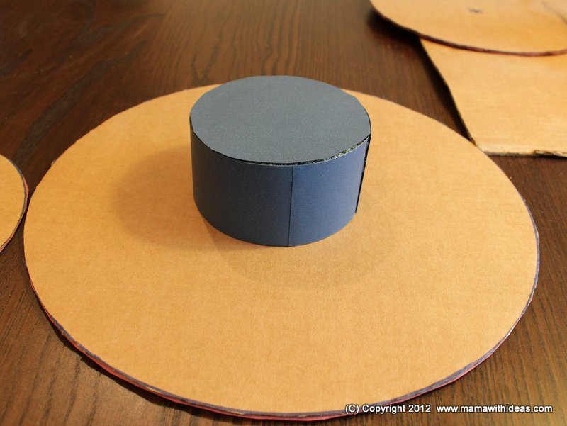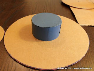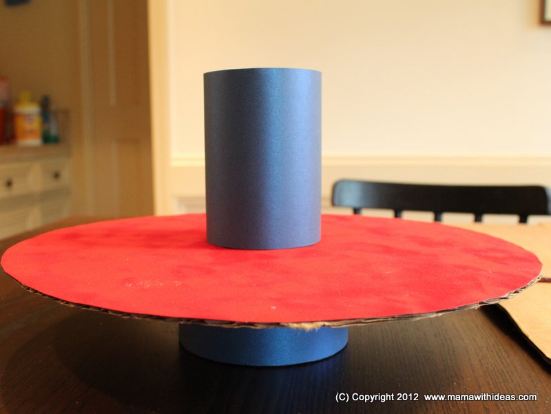 Use these pen marks to help you line up the cylinder and glue into place. I placed my wide/short cylinder onto the bottom (biggest) circle to create the base of the cupcake stand. As the foam shed bits of dust, I cut another circle of card to cover the bottom and glued into place.