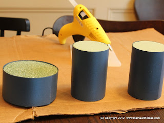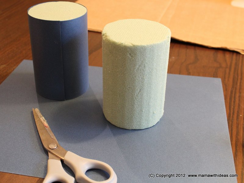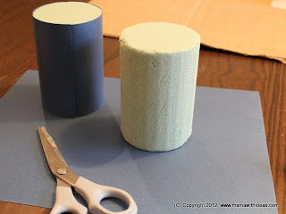 Next, cover your cylinders of foam (or recycled cans/tubes) with colored paper... this can be the same paper as the circles, or a contrasting/complementing color or pattern. I chose a slightly glittery royal blue!