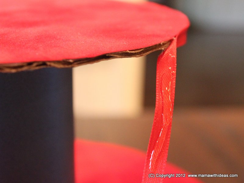 Finally, you need to disguise the edge of the cardboard circles. To do this, glue a length of ribbon around the edge (hanging down if you have chosen a wide ribbon).