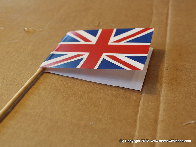 Firstly, cut out the larger Union Jack flag, fold in half around a wooden skewer and glue. Push into the top of your cupcake stand (this is why florist's foam is useful!).