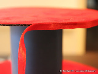 I then glued another cylinder to the center of the top of the base circle. One important thing to remember is to line up the line where you have wrapped the paper around the cylinder. This makes it look so much neater. Repeat with the final cylinder and circle.