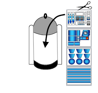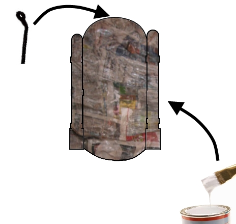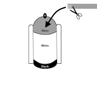 Step 9: Now to decorate R2D2, you will need to cut strips of crepe paper approximately 2" thick and make cuts to create a fringe. Layer these fringes of crepe paper starting at the bottom and working towards the top. Put a layer of black fringing on the bottom of the cylinder to create the impression of a gap underneath R2D2's body. Then white fringing all over the body & legs. Finally, silver or grey fringing over the dome of his head.