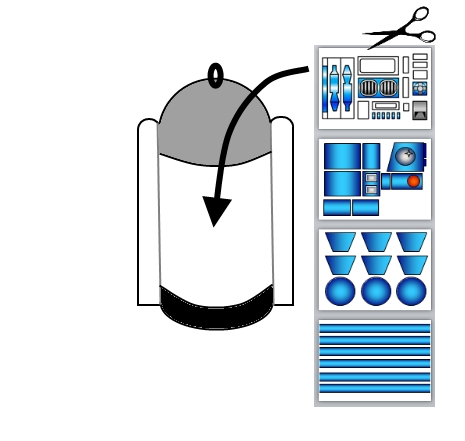 Step 13: Finally, decorate the outside of R2D2 by cutting out the shapes on the printable below. You can also use an empty plastic bottle cap to glue on for R2D2's camera (see the photo below to see what I mean)!