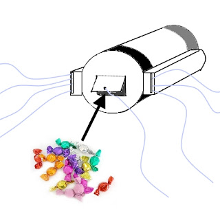 Step 11: Open the trap door and fill the interior with individually wrapped candies and small treats ... be careful to keep the weight realistic! Push the trap door shut, but do not glue or tape shut.