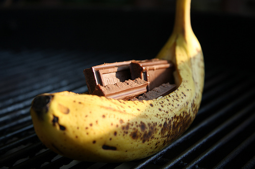 This is such a simple recipe. Using a sharp knife, make a slit length-ways on the inner curve of each banana. Force chunks of your favourite chocolate into the slit. Pour in a tablespoon of brandy and/or a tablespoon of nuts if you like. Then place the banana gently on a barbecue grill and cook until the skin is black and the contents melted and gooey! Carefully take the bananas off the grill, and serve (still in their skins) in a bowl with a dollop of icecream or glug of indulgent cream.