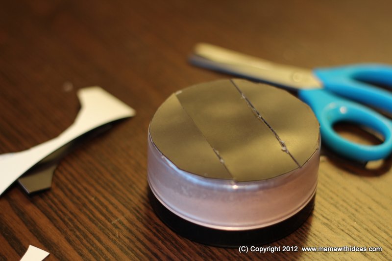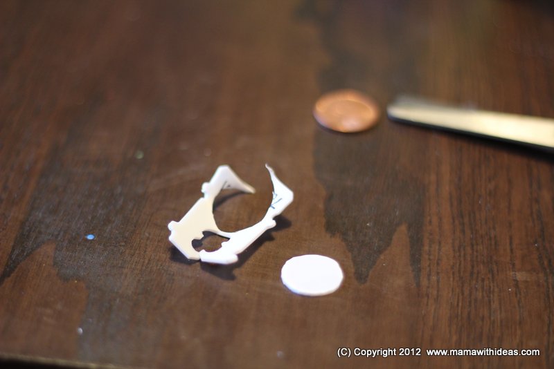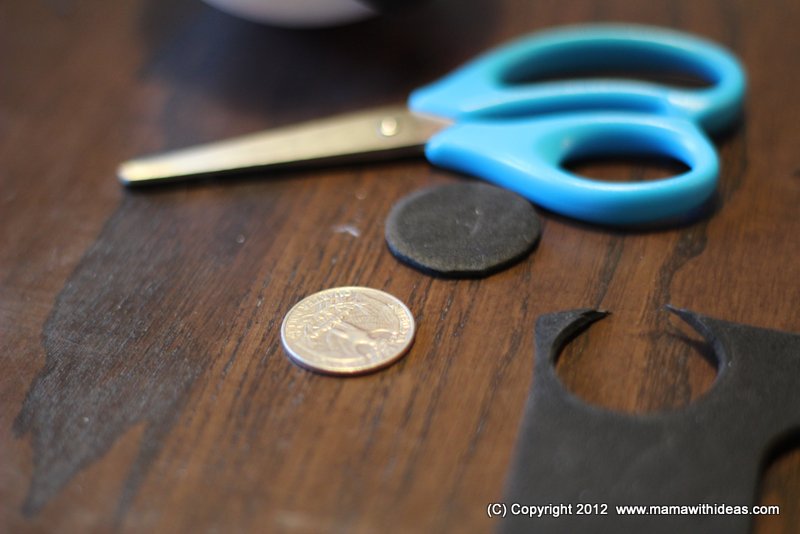 Using an old bread tag (or some white craft foam), cut a circle using a penny as a template. Glue onto the black circle. It's as easy as that!