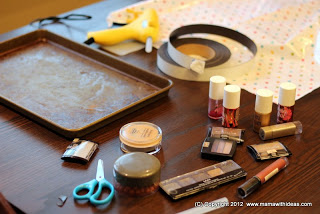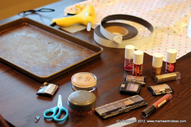 Cut strips of magnetic tape, and glue to the back of your makeup items. The heavier the item, the more magnetic tape you will need. The items can then be put on the tray.