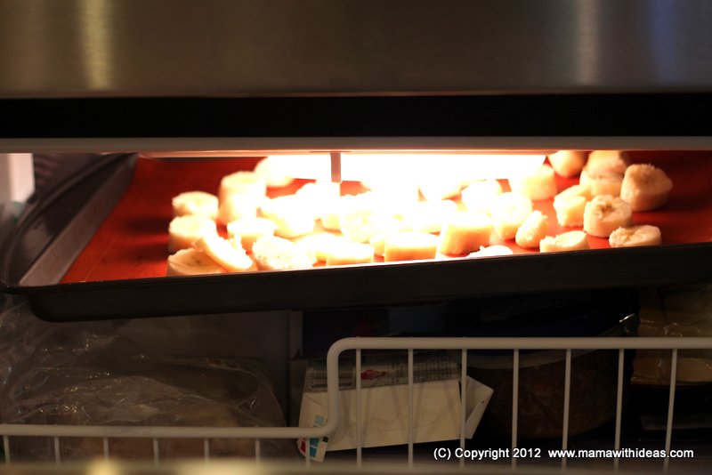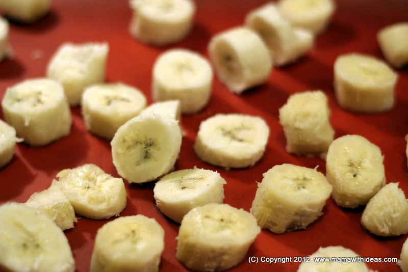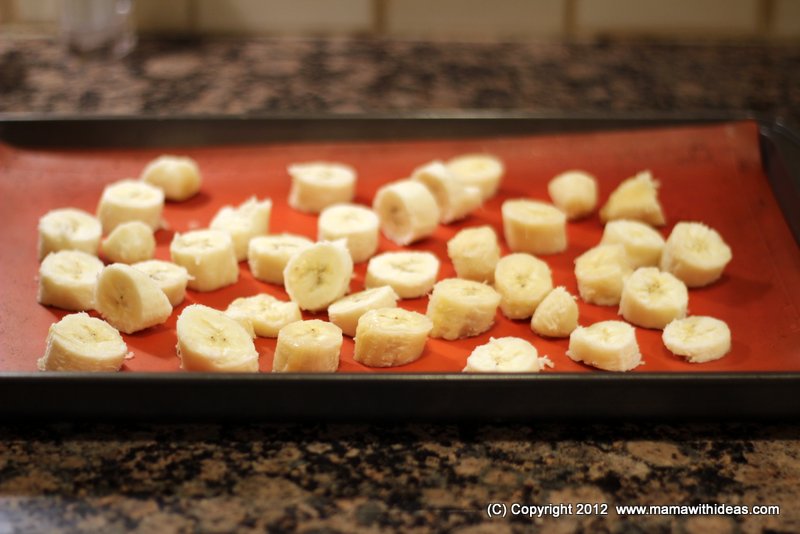 Firstly, peel and slice your bananas and spread out on a lined cookie sheet. Pop the sheet in the freezer overnight so that the banana slices have a chance to get solid.