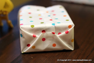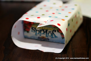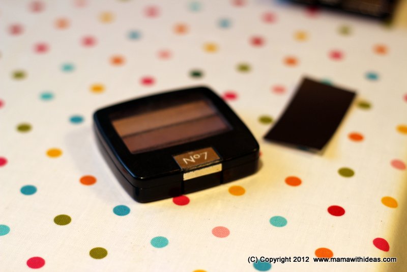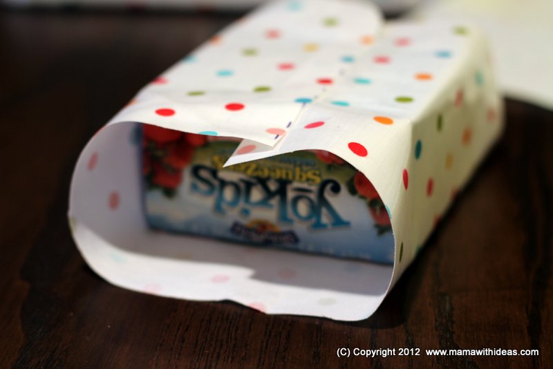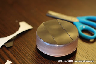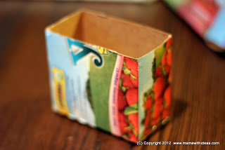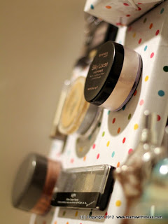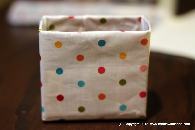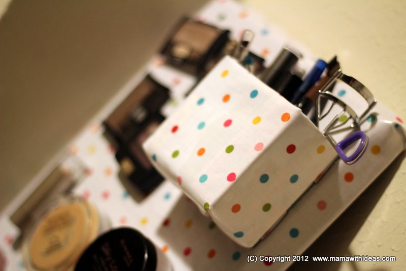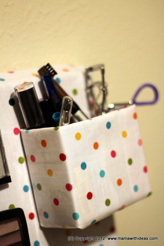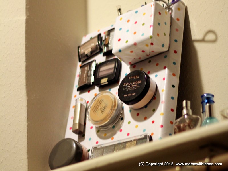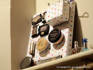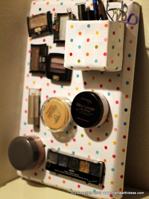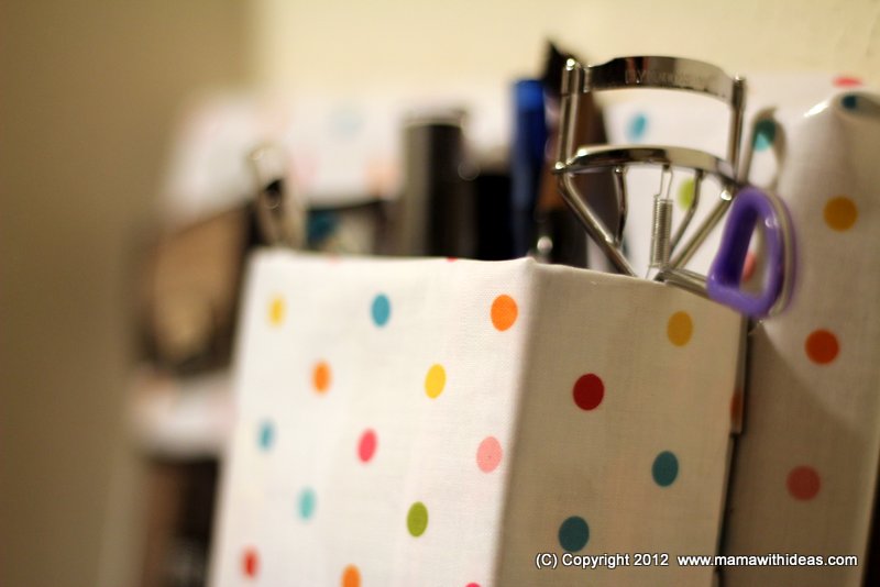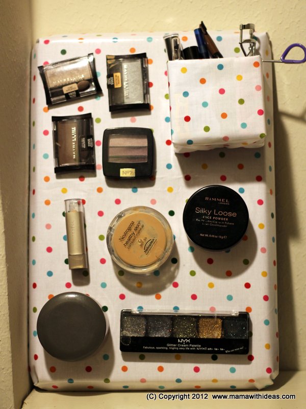 Cut a small box to the right size to store your smaller items such as mascaras, kohl pencils etc... Wrap it in some more of the fabric and glue in place, neatening the edges. Attach more magnetic strips to the back of the box and attach to the board.