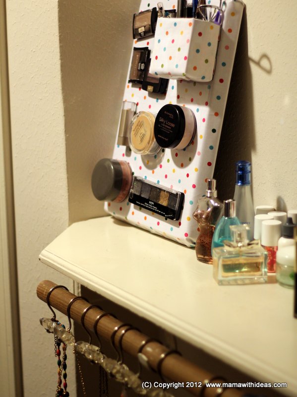 You can either prop the board up on your bathroom counter or closet shelf, or hang on the wall next to your mirror. All the items you need are easily visible and obtainable, and kept out of the way! Easy peasy, and only 20 minutes to make!