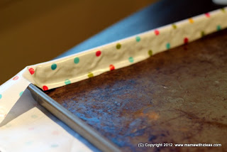 Cut a piece of fabric a few inches wider than your cookie tray all the way around. Place the cookie tray on the wrong side of the fabric and fold the fabric up and over the sides of the tray. Glue into place, making neat folds at the corners. Turn the tray over and you have a pretty magnetic board!