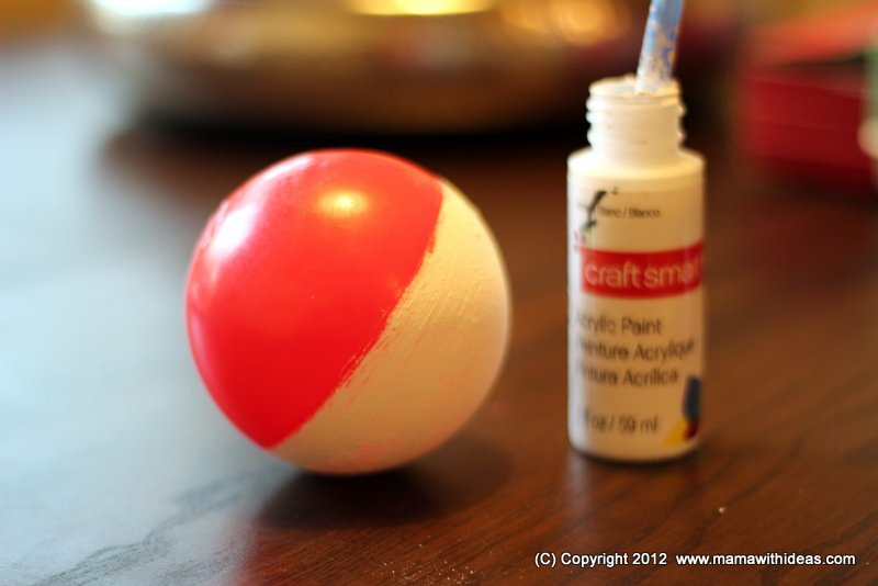 Firstly, paint half the sphere of your ball white (you could use a white ball and red paint if you preferred). Allow to dry, and apply another coat if necessary.